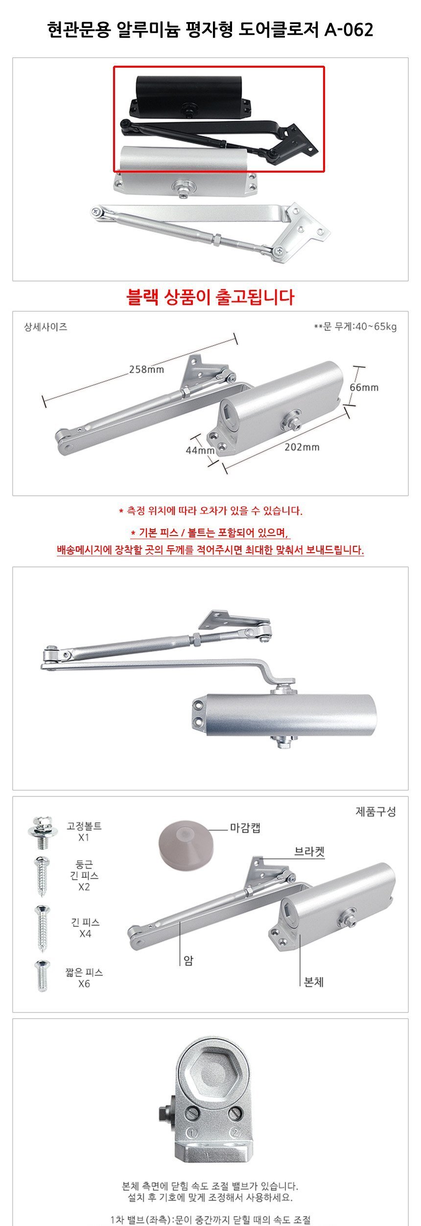 현관문용 알루미늄 평자형 도어클로저 A-062 블랙