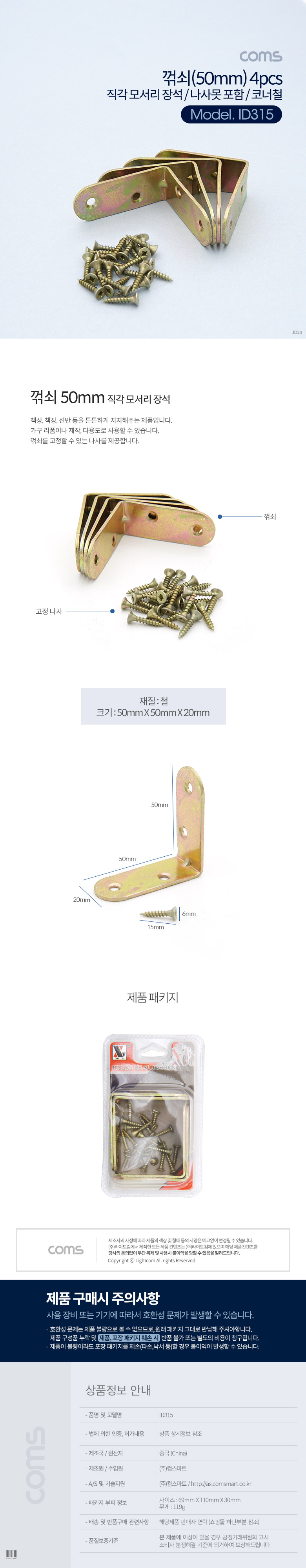 Coms ㄱ자 꺽쇠 4pcs 50mm 직각 모서리 장석 나사못 포함 코너철 코너철 다보 보