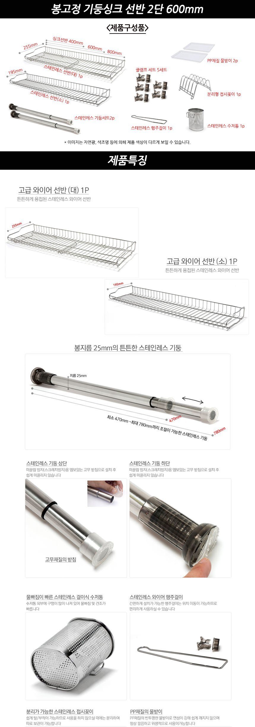봉고정 기둥싱크 선반 2단 600mm 이미지/