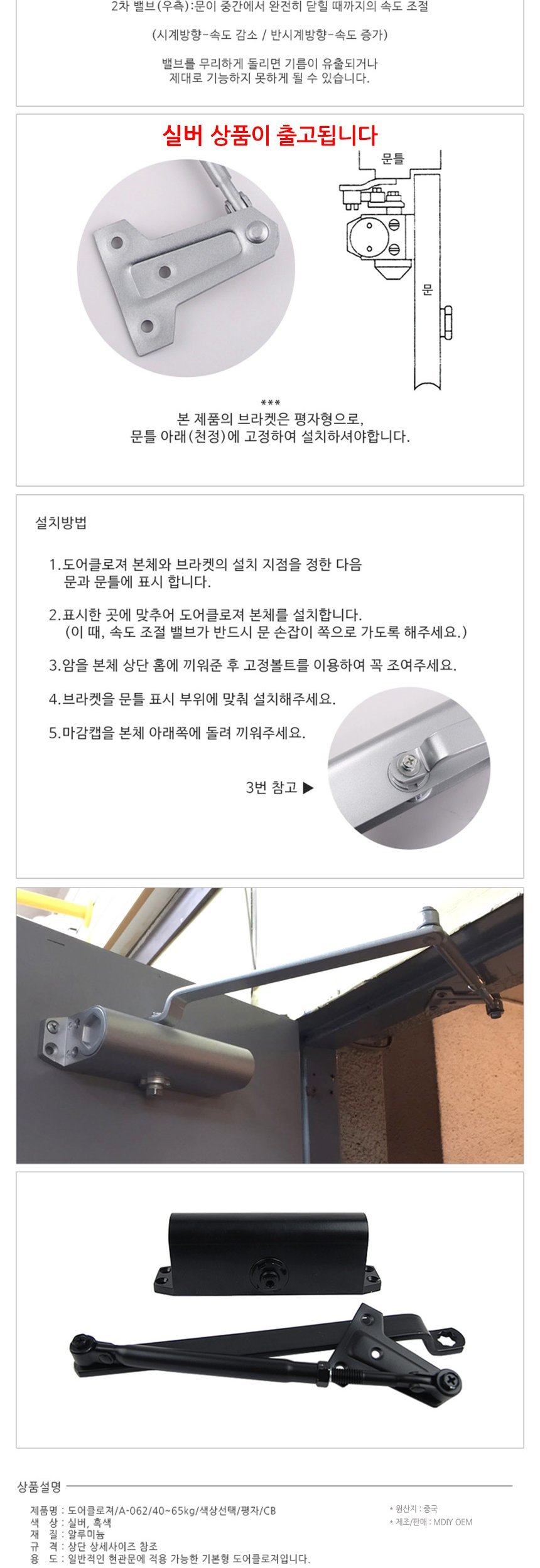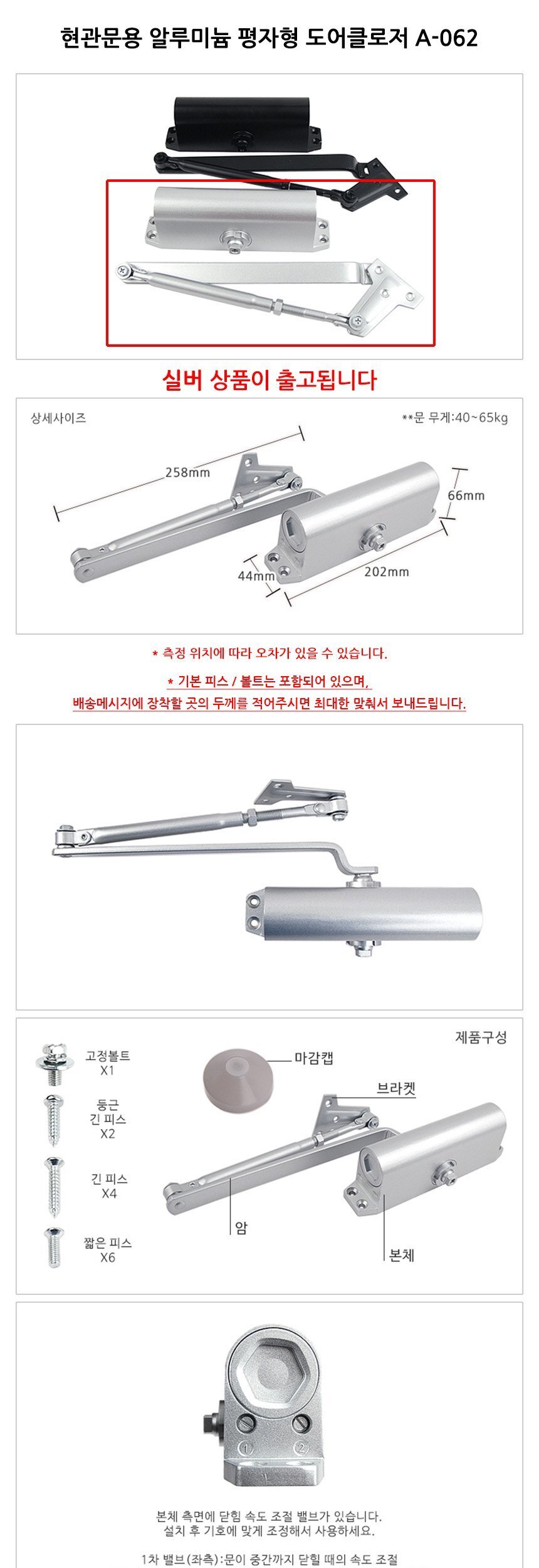 현관문용 알루미늄 평자형 도어클로저 A-062 실버