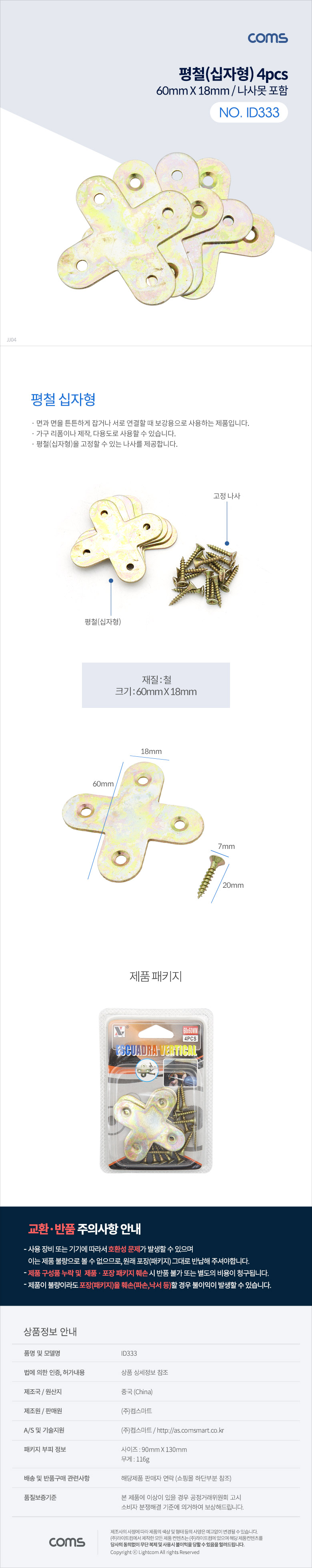 Coms 평철 십자 4pcs 60mm X 60mm 나사못 피스포함 연결철물 보강평철 철물