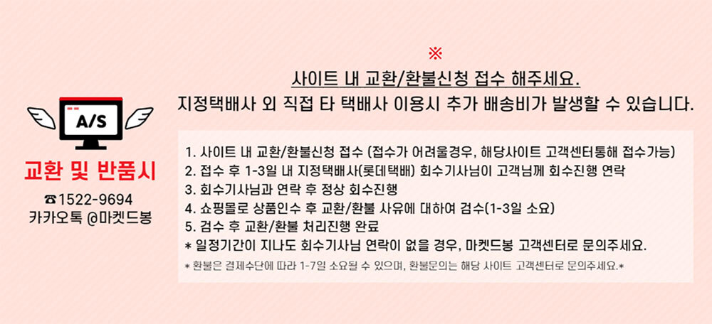 • 초기제품 이상의 경우 동일한 제품으로 1:1 교환원칙, 사용후 제품이상은 A/S를 원칙으로 합니다.