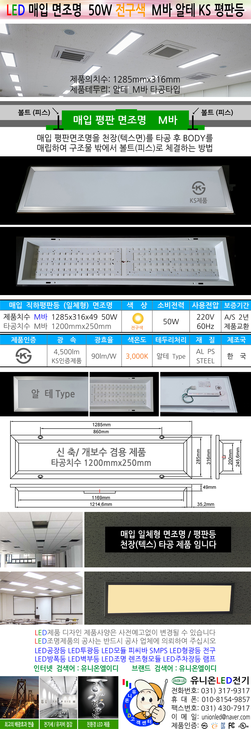 <상품명 : 평판등 면조명 M바 알테 50W 전구색 1285mm KS 매입>