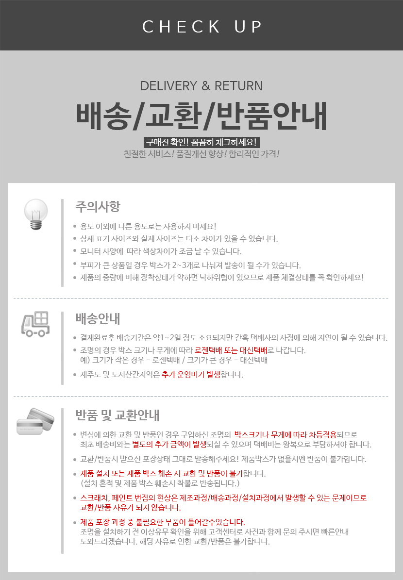 • 초기제품 이상의 경우 동일한 제품으로 1:1 교환원칙, 사용후 제품이상은 A/S를 원칙으로 합니다.