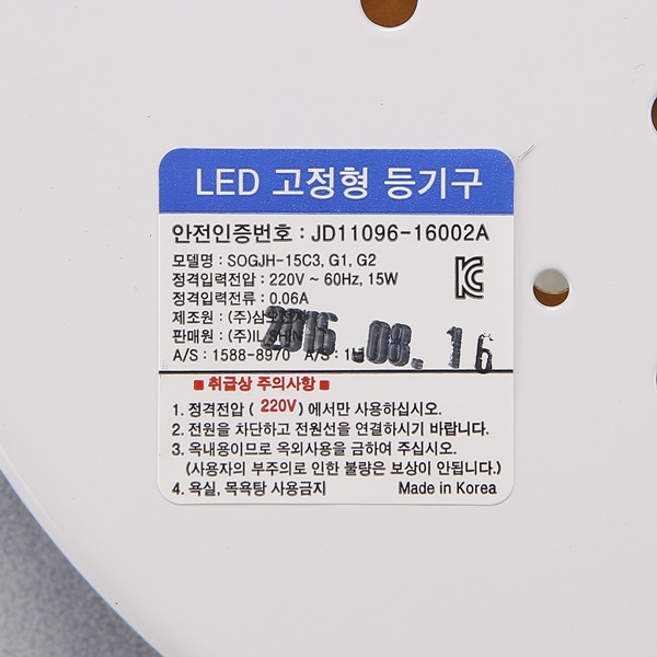 외형치수 파이237mm, 색온도6500K 소비전력15W 입력전압220V