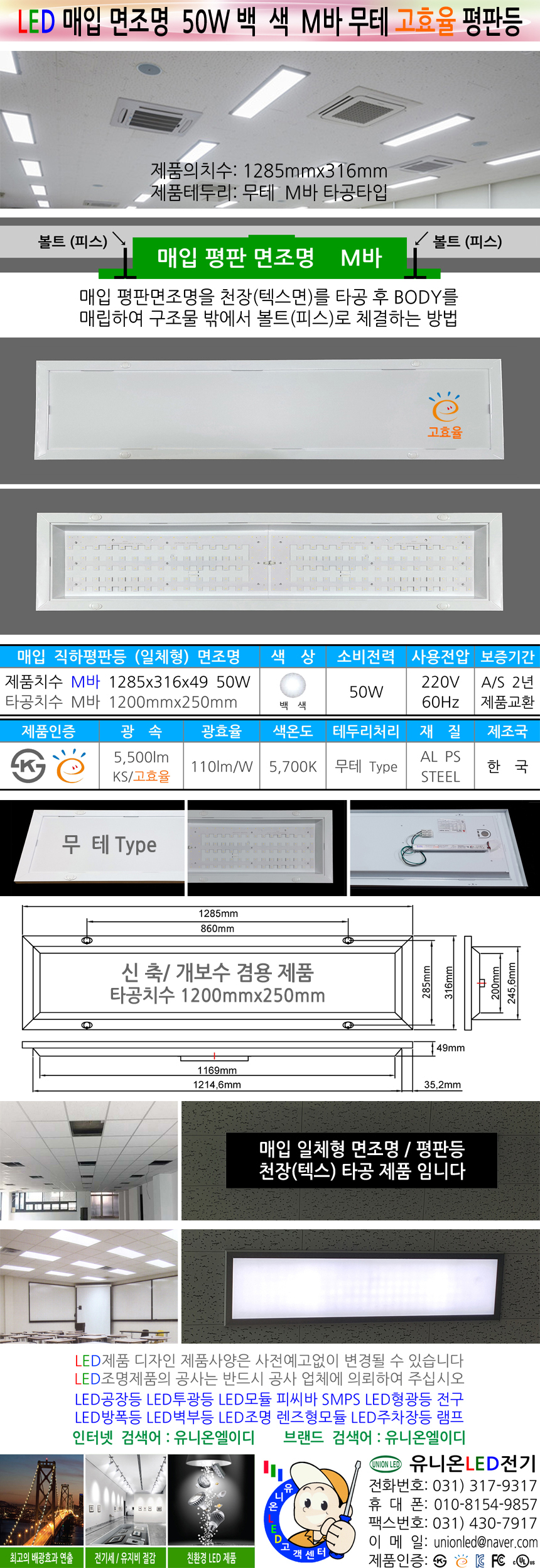 <상품명 : 평판등 면조명 M바 무테 50W 백색 1285mm 고효율>
