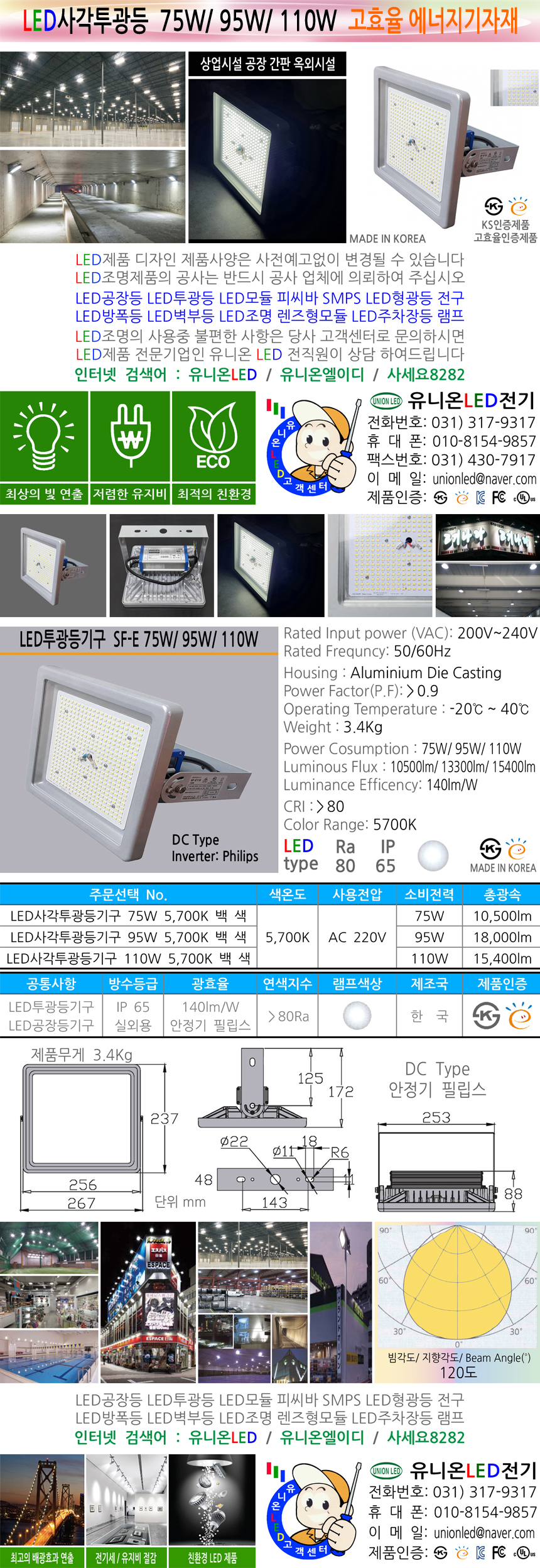 유니온엘이디 사각투광등 75W 95W 110W 공장등 이미지/