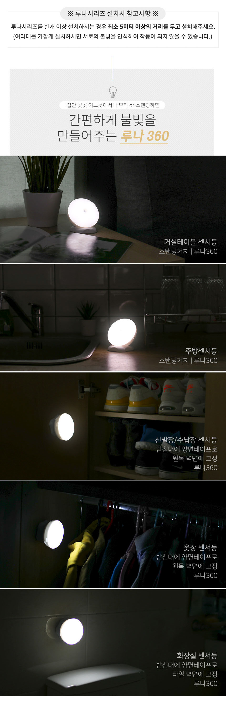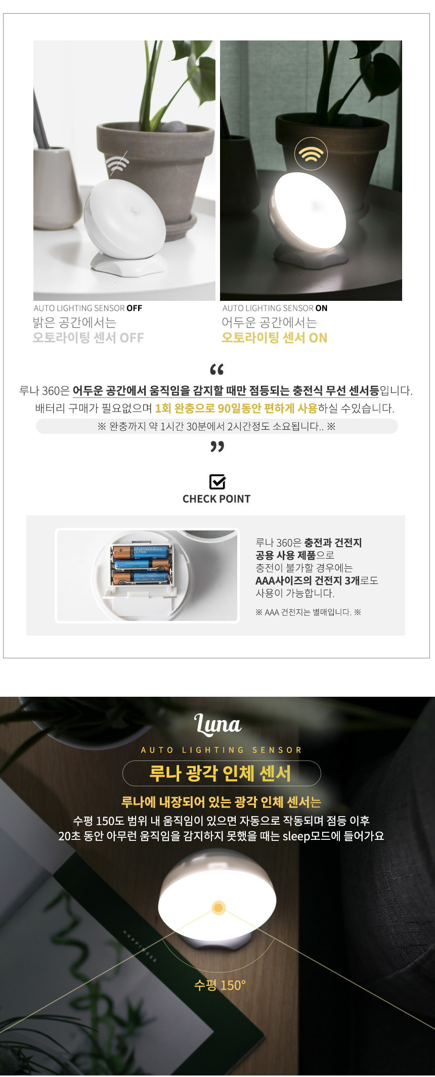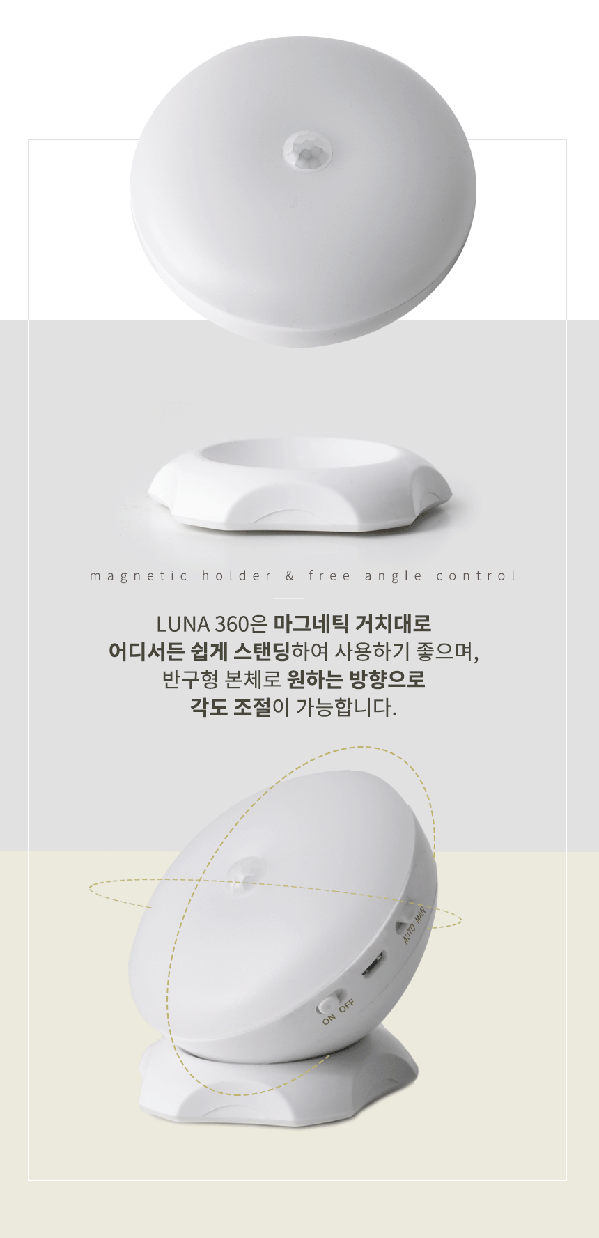 루나 360 무선 센서등 배터리/충전식 겸용 무드등 수유등 현관등 욕실등 취침등 수면등 스