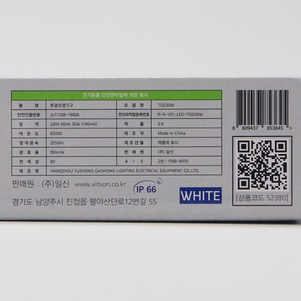 품명및모델명 : 사각LED투광기 화이트 슬림/30W 노출 주광/전구 KC