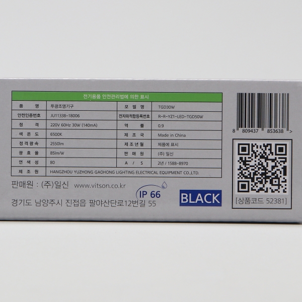품명및모델명 : 사각LED투광기 블랙 슬림/30W 노출 주광/전구 KC
