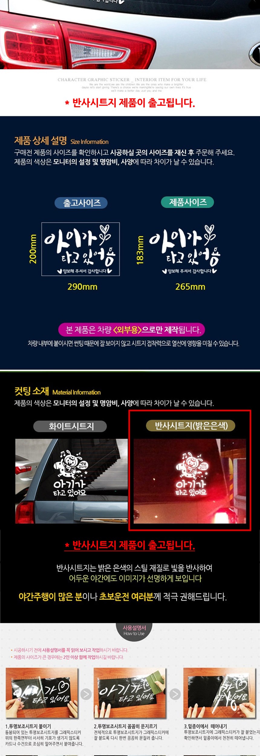 자동차스티커 아이가타고 캘리화이트 반사시트지 이미지/