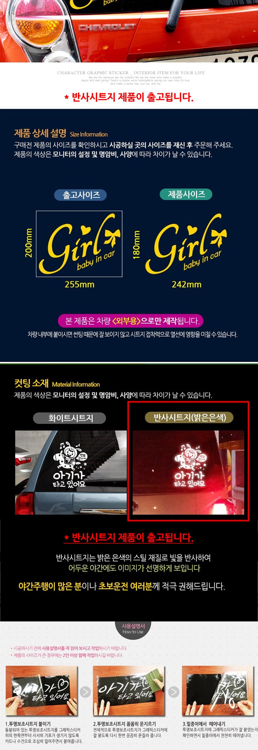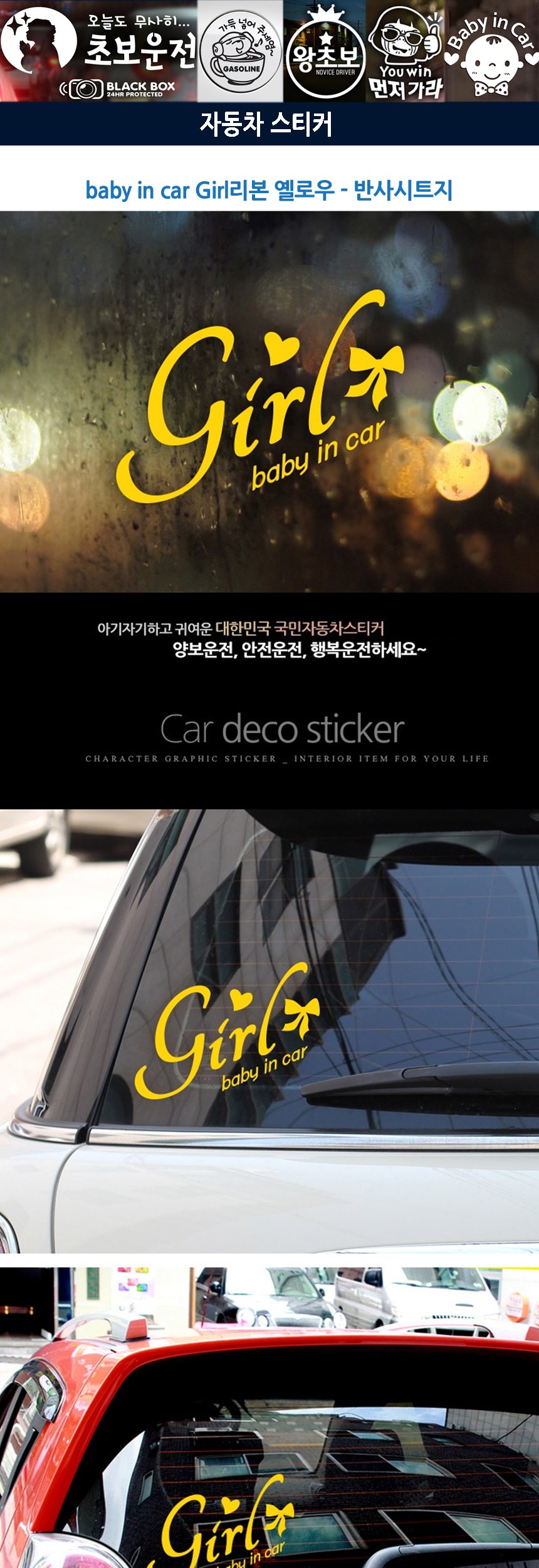 자동차스티커 BABYINCAR Girl리본옐로우 반사시트지