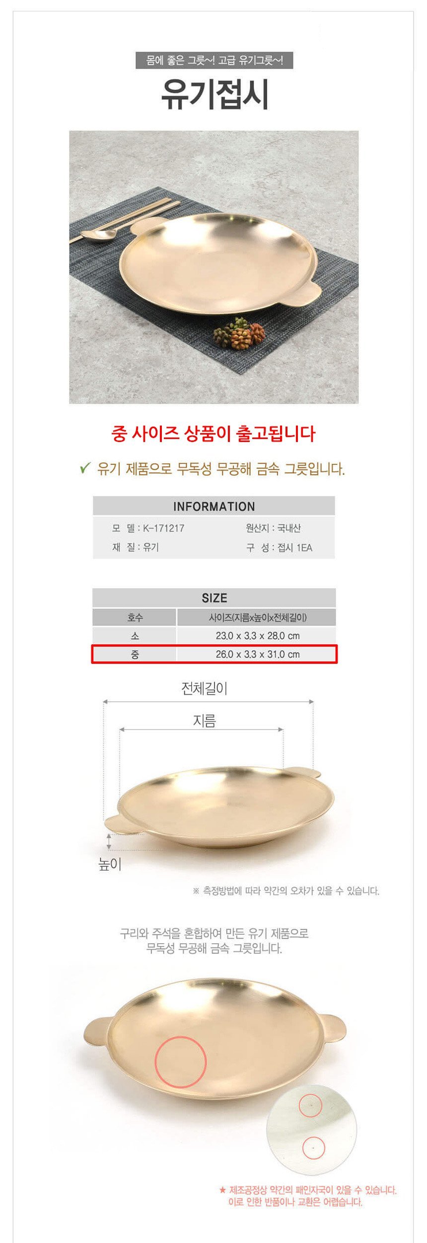방짜유기 다용도 접시 중형 26cm