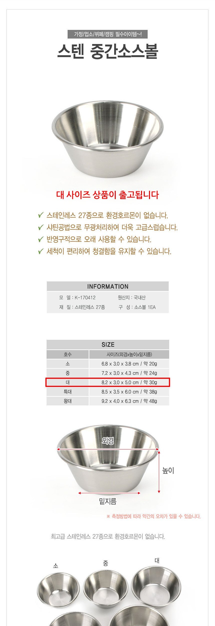 스테인레스 중간 소스볼 종지그릇 대형