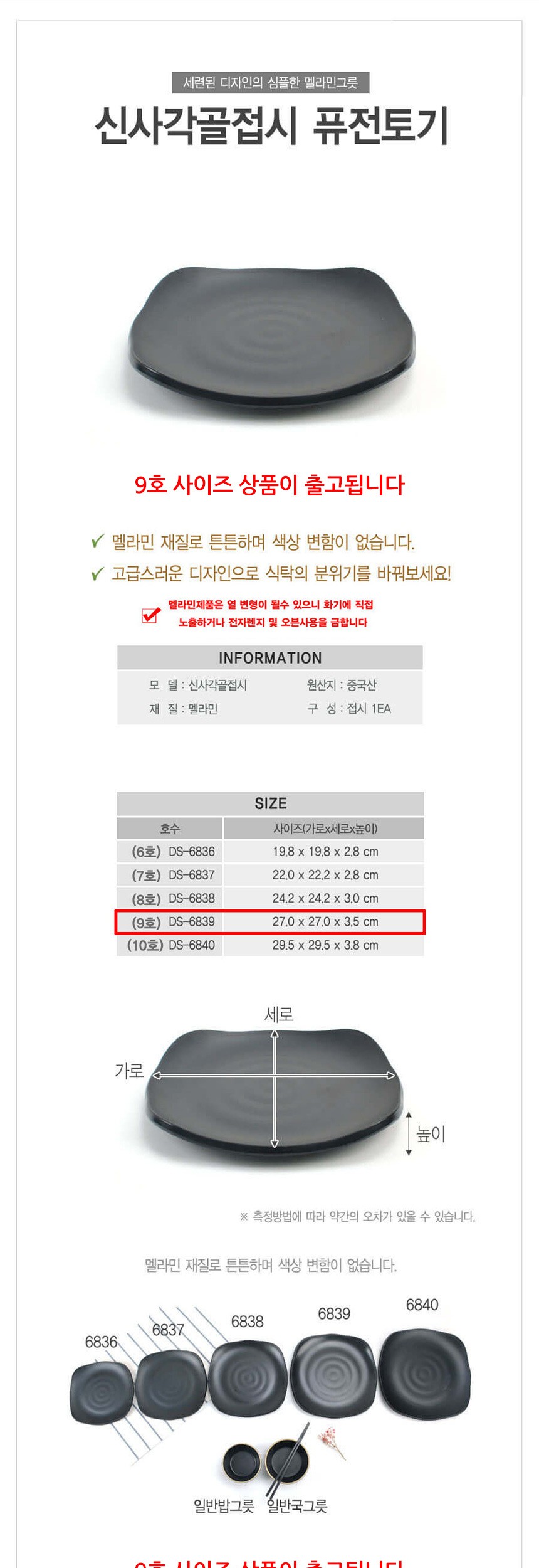 멜라민 퓨전토기 신형 사각 골접시 9호