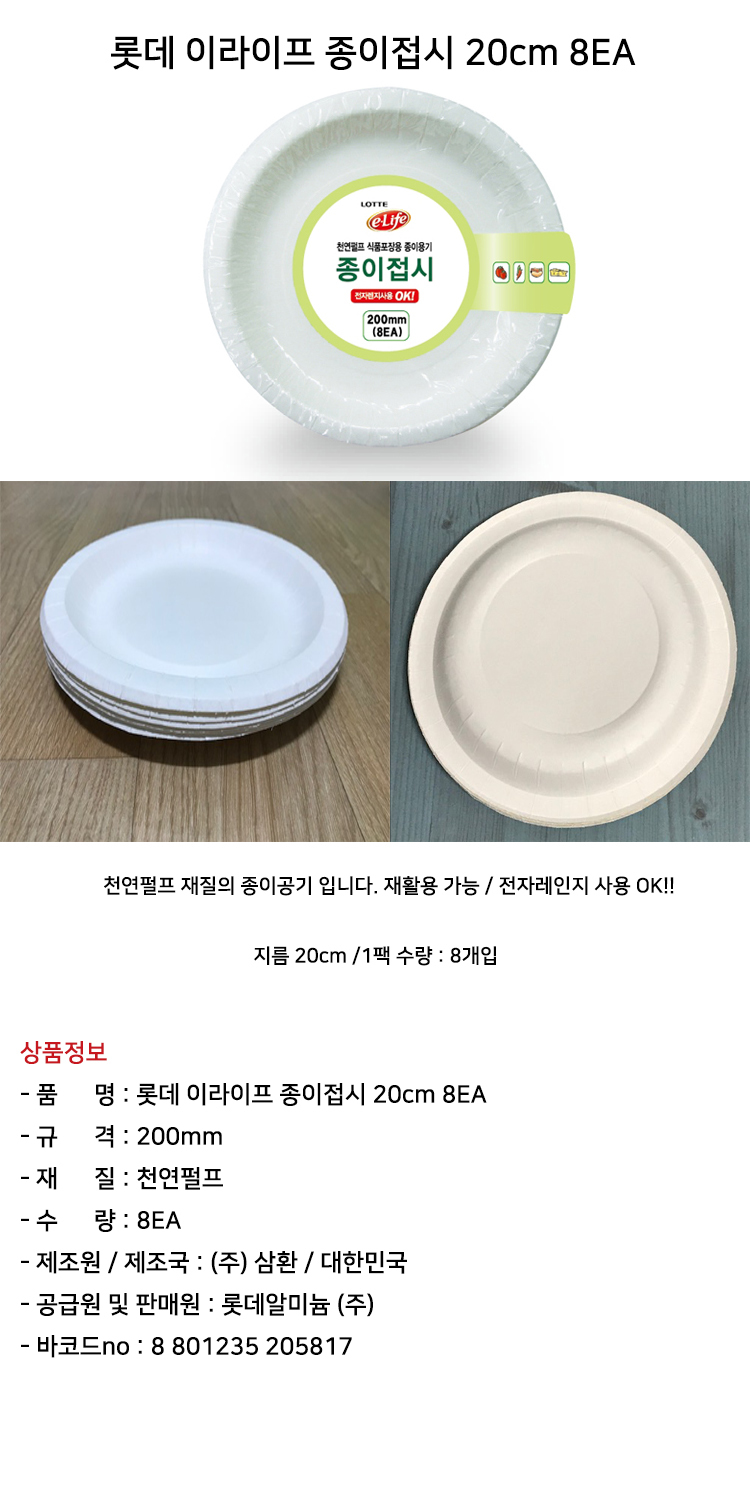 롯데 이라이프 종이접시 20cm 8EA