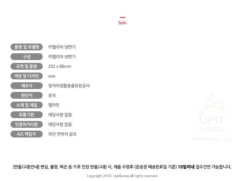• 반품/환불조건: 도착후 1주일 이내 사용하지 않은 상태에서 가능합니다,초기제품 이상의 경우 동일한 제품으로 1:1 교환원칙, 사용후 제품이상은 A/S를 원칙으로 합니다,