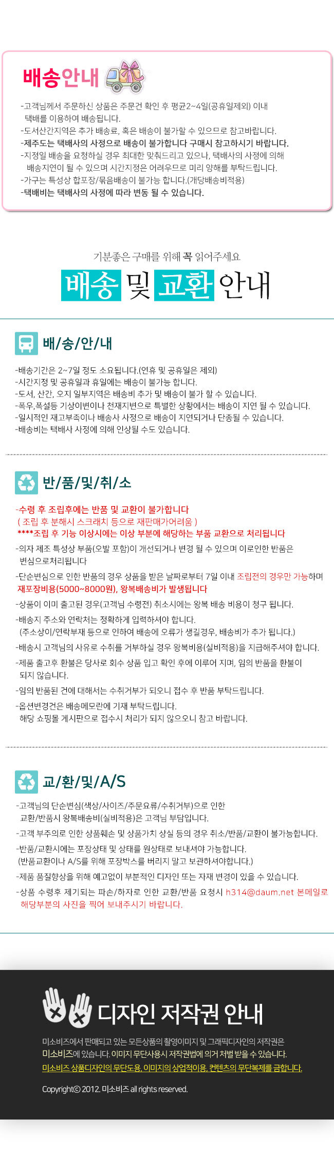 • 초기제품 이상의 경우 동일한 제품으로 1:1 교환원칙, 사용후 제품이상은 A/S를 원칙으로 합니다.