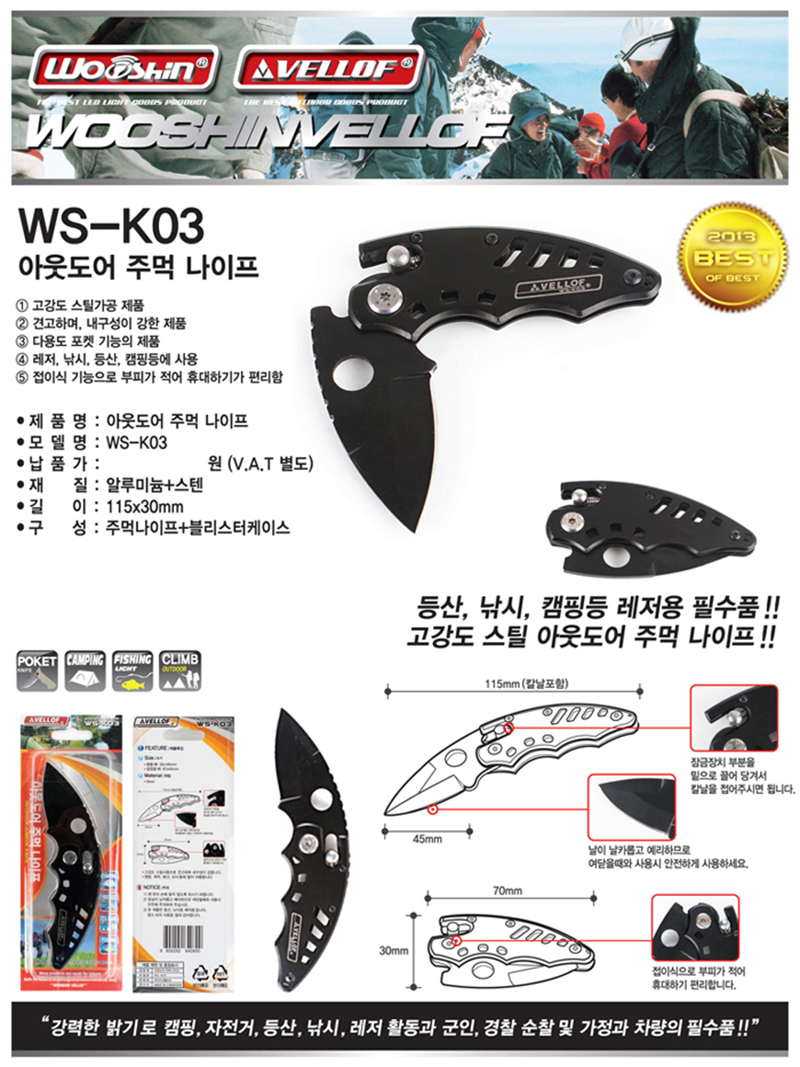 1. 품명 및 모델명 : 벨로프 아웃도어 주먹 나이프 WS K03다용도 다목적 / 상세정보별도표시