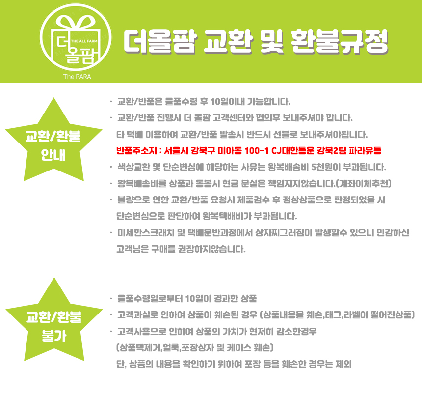 • 초기제품 이상의 경우 동일한 제품으로 1:1 교환원칙, 사용후 제품이상은 A/S를 원칙으로 합니다.