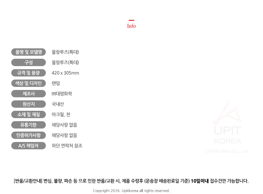 • 반품/환불조건: 도착후 1주일 이내 사용하지 않은 상태에서 가능합니다,초기제품 이상의 경우 동일한 제품으로 1:1 교환원칙, 사용후 제품이상은 A/S를 원칙으로 합니다,