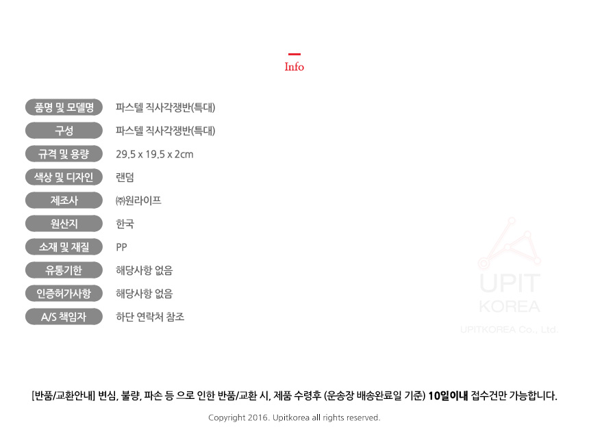 • 반품/환불조건: 도착후 1주일 이내 사용하지 않은 상태에서 가능합니다,초기제품 이상의 경우 동일한 제품으로 1:1 교환원칙, 사용후 제품이상은 A/S를 원칙으로 합니다,