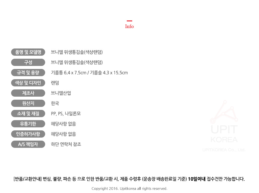 • 반품/환불조건: 도착후 1주일 이내 사용하지 않은 상태에서 가능합니다,초기제품 이상의 경우 동일한 제품으로 1:1 교환원칙, 사용후 제품이상은 A/S를 원칙으로 합니다,