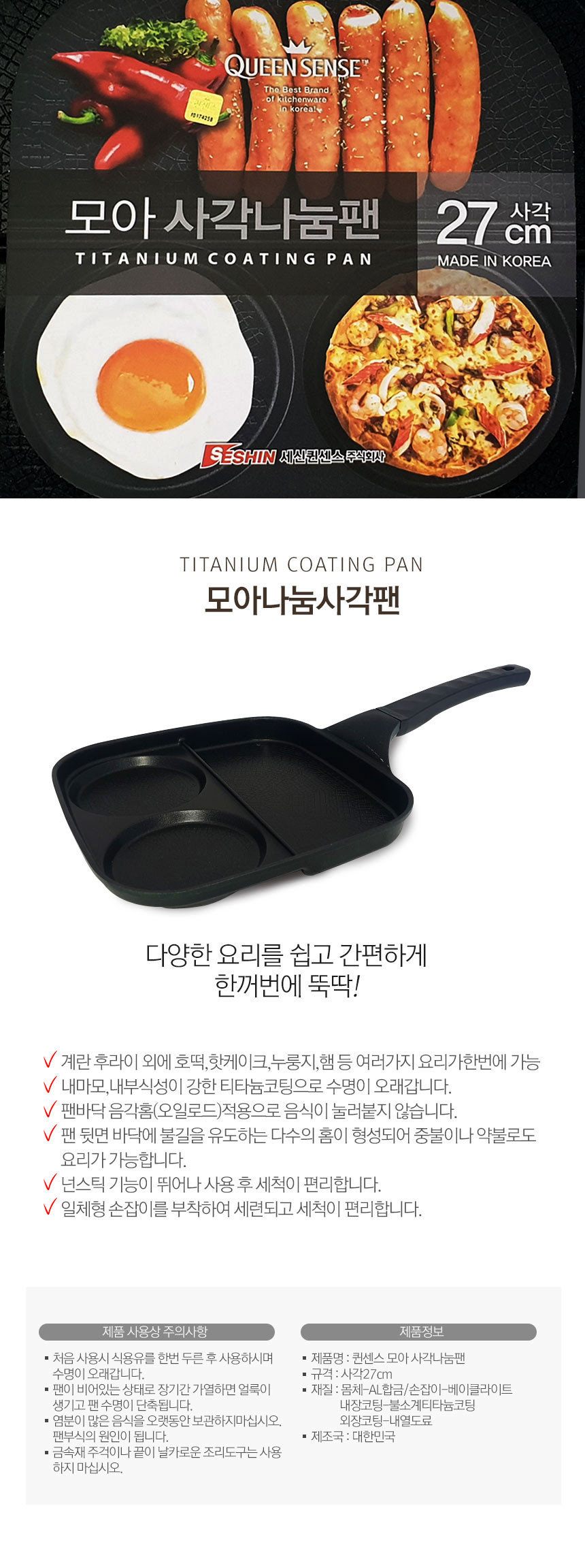 모아 사각 나눔팬 27cm 호떡 핫케이크 티타늄 코팅 팬
