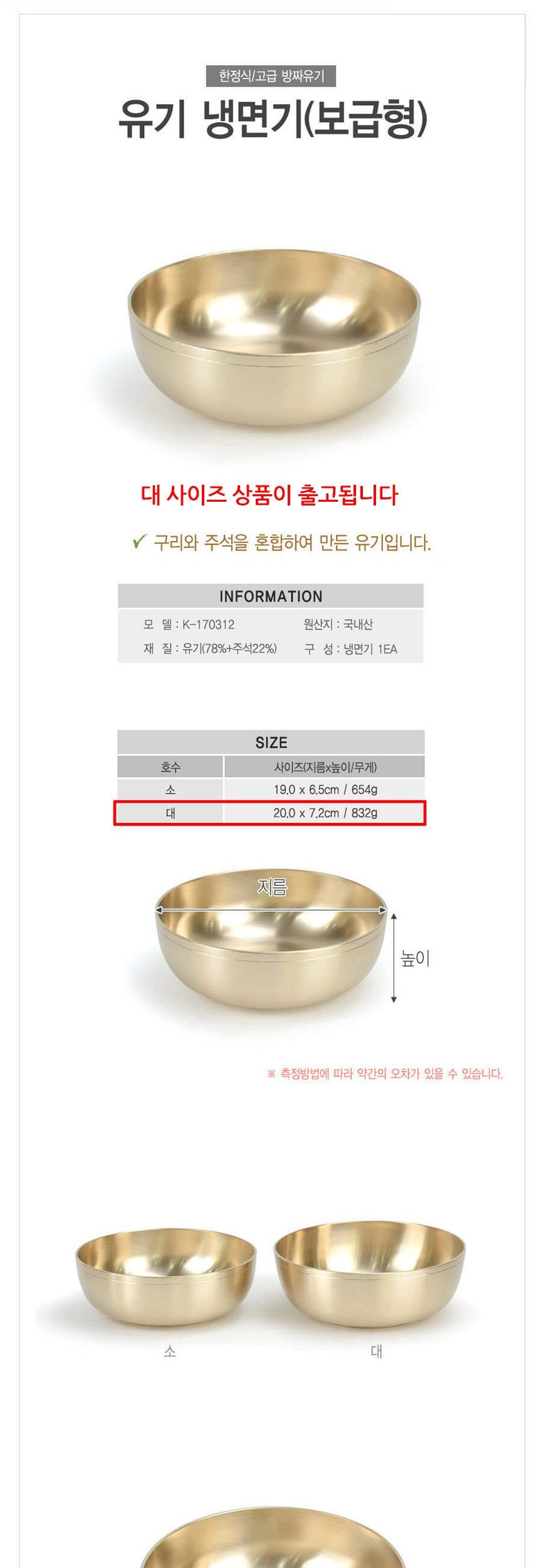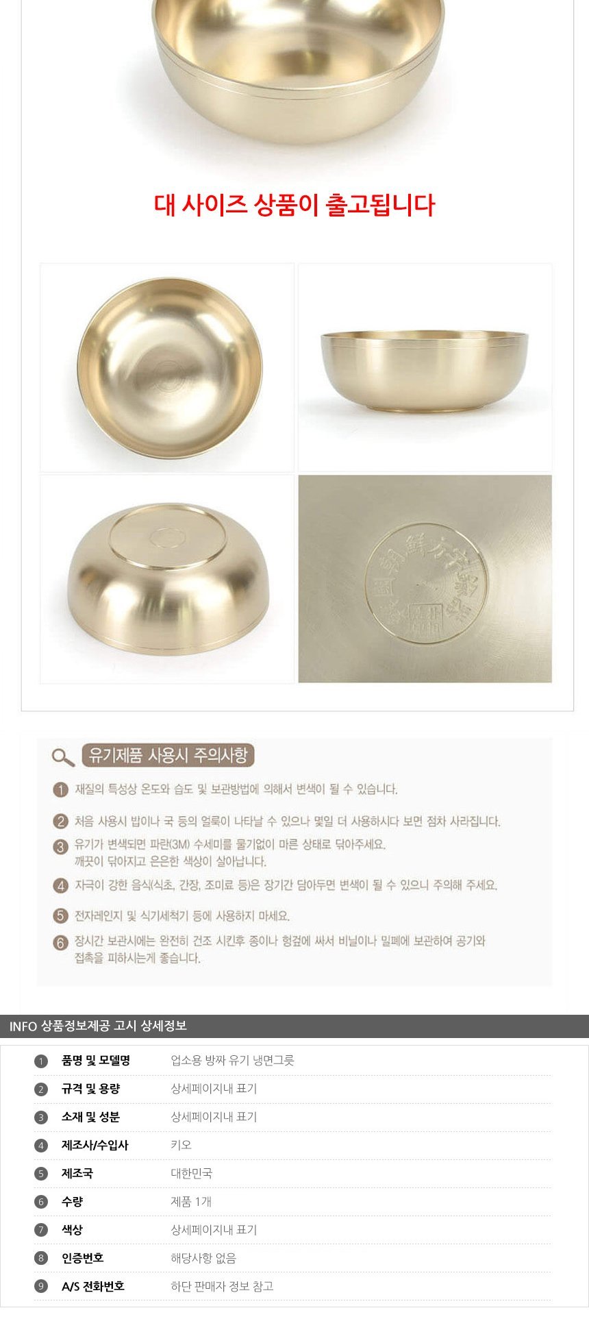 업소용 방짜유기 냉면그릇 대형 20cm 이미지/