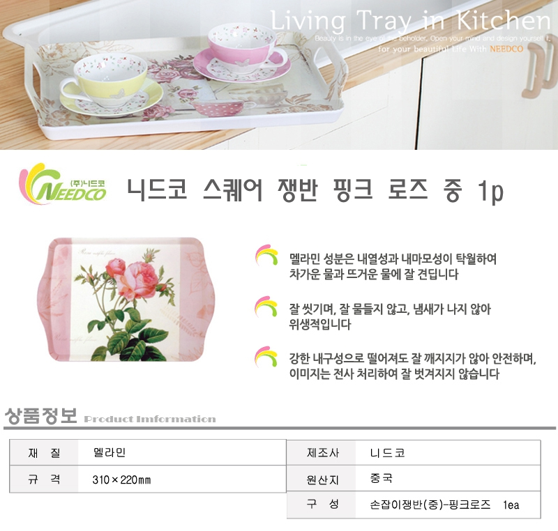니드코 스퀘어 쟁반 핑크 로즈 중 1p 예쁜쟁반 고급쟁