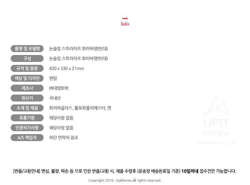 • 초기제품 이상의 경우 동일한 제품으로 1:1 교환원칙, 사용후 제품이상은 A/S를 원칙으로 합니다.