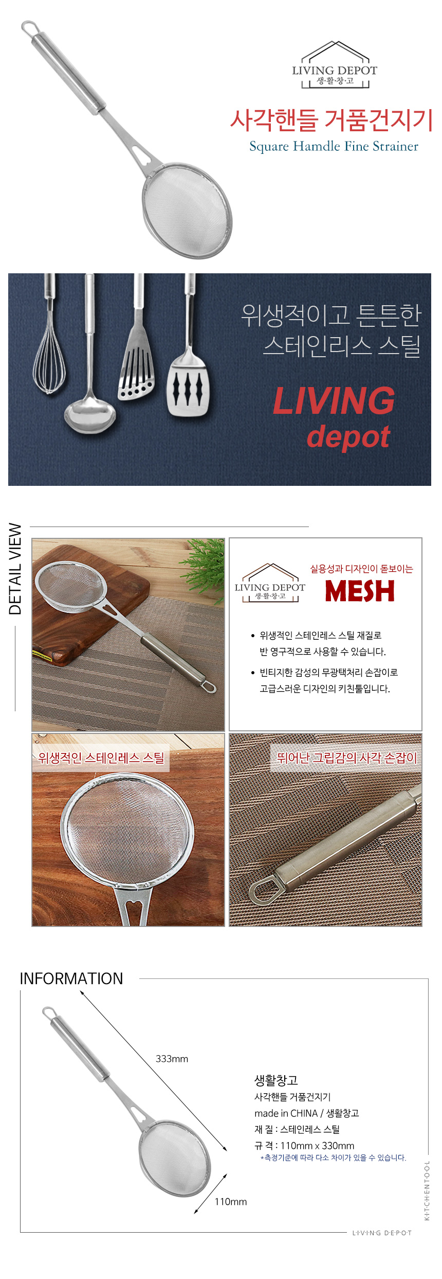1. 품명 및 모델명 : 생활 사각핸들 거품건지기 1P 주방 뜰채 면건지기 / 상세정보별도표시