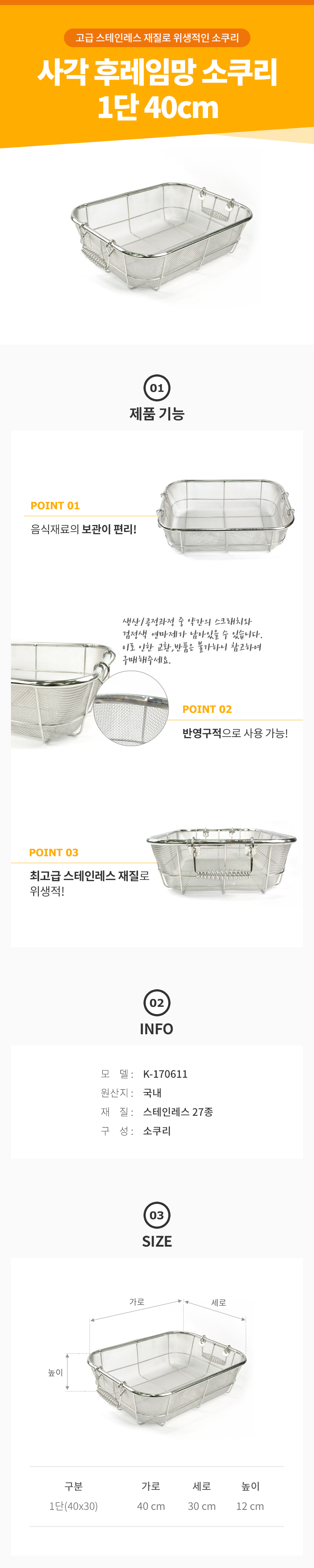 사각 후레임망 소쿠리 1단 40cm 채반 건지기 바구니