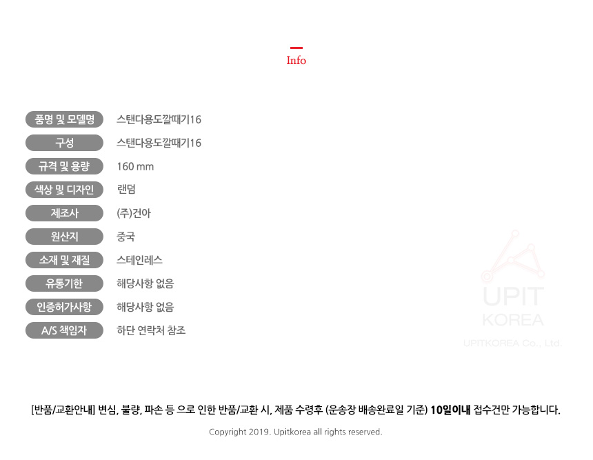 • 반품/환불조건: 도착후 1주일 이내 사용하지 않은 상태에서 가능합니다,초기제품 이상의 경우 동일한 제품으로 1:1 교환원칙, 사용후 제품이상은 A/S를 원칙으로 합니다,