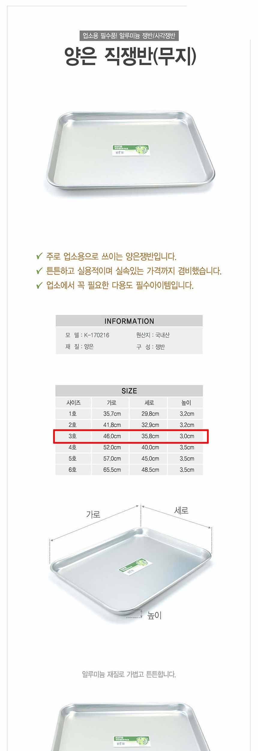 업소용 무지 사각 알루미늄 쟁반 3호 46 x 36cm