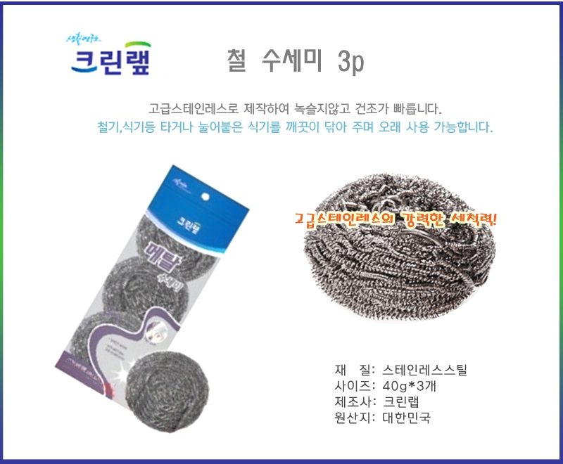 크린랲 철 수세미 3p 주방수세미 철수세미 스텐수세미