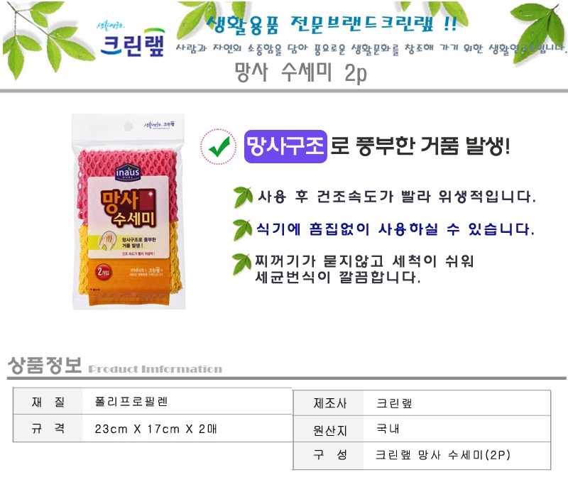 크린 망사 수세미 2입 1개 부엌수세미 다목적수세미