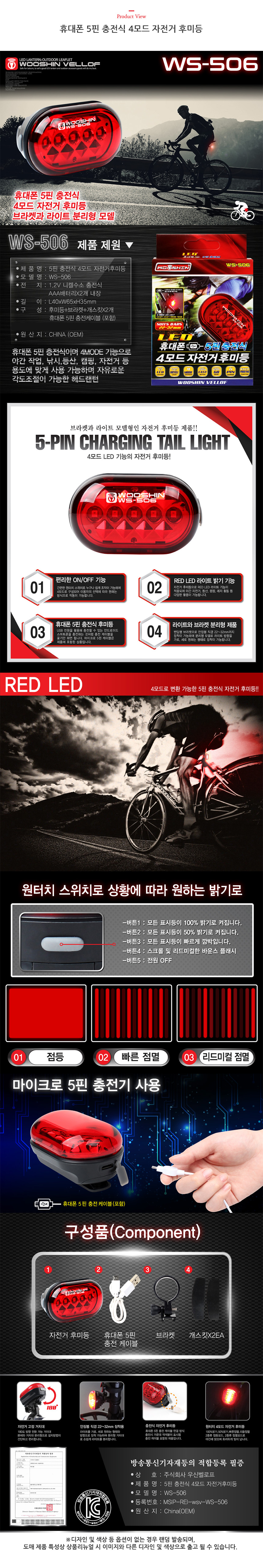 휴대폰 5핀 충전식 4모드 자전거 후미등 1760 이미지/