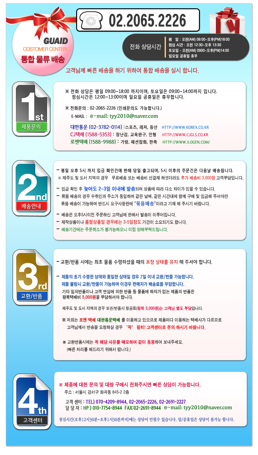 고객상담안내 : 월~금 10:00 ~ 17:00 토요일 및 일요일 휴무 | 개인정보관리 책임자 : 김진석