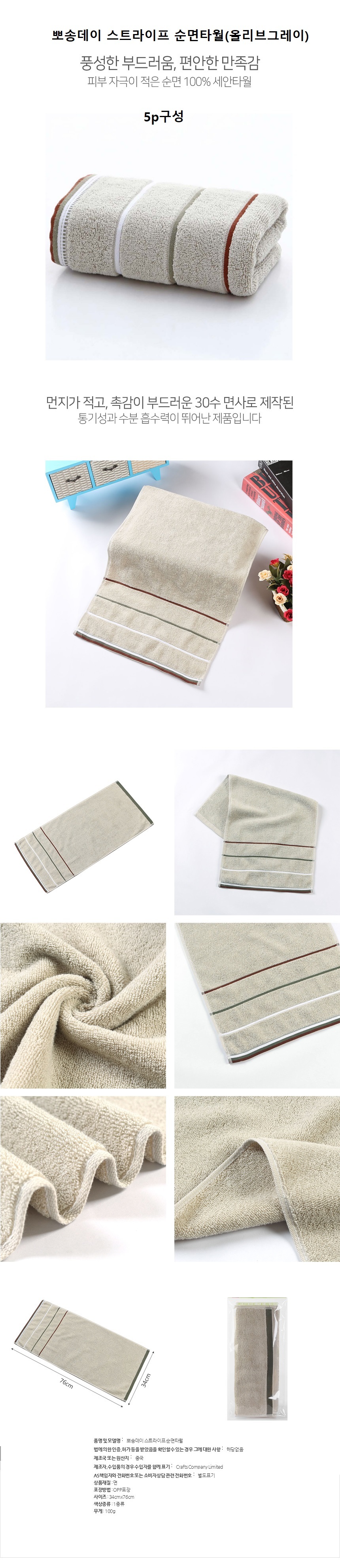 뽀송뽀송한 올리브그레이 30수 순면타월5P 이미지/