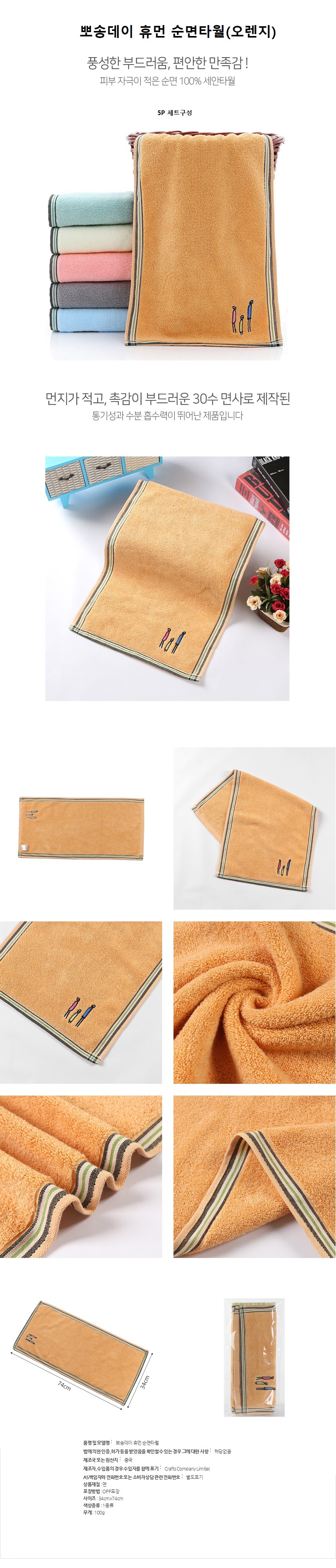 뽀송뽀송한 휴먼30수 순면타월5P