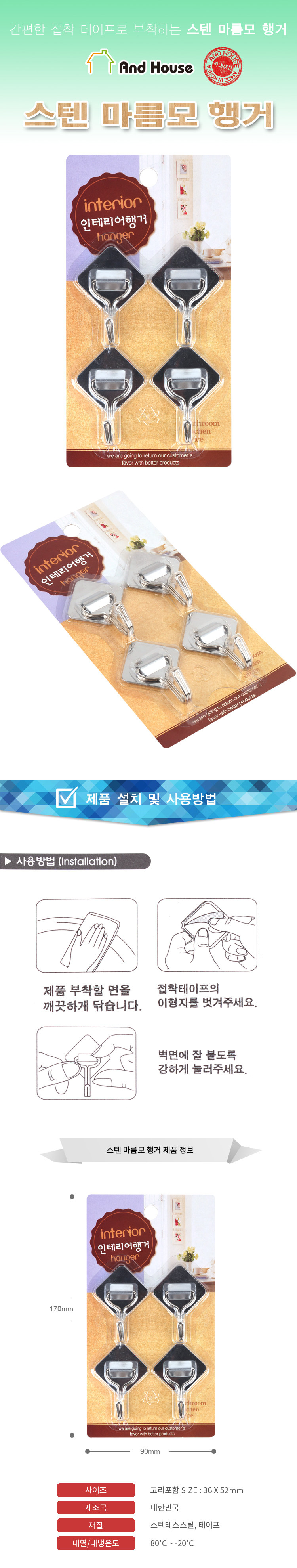 스텐마름모 벽걸이 미니행거 4개입 테이프 부착식