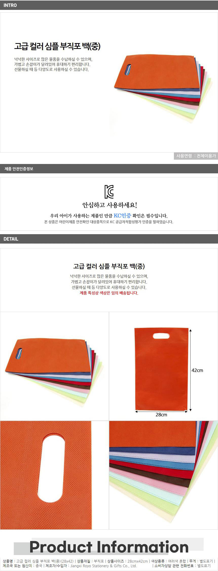 심플한 컬러 부직포백 중형-색상랜덤 포장봉투 선물용 이미지/