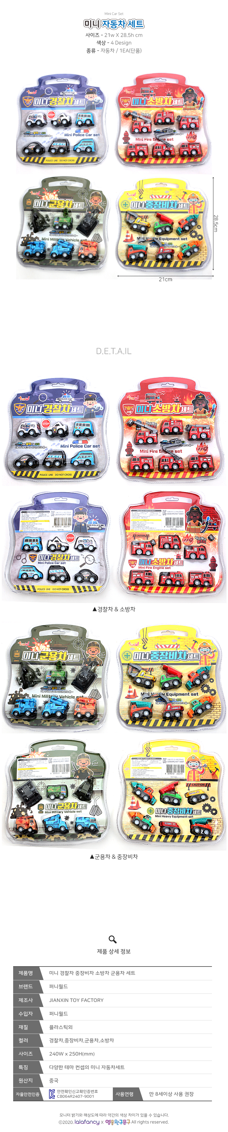 1. 품명 및 모델명 : 미니 경찰차 중장비차 소방차 군용차 세트