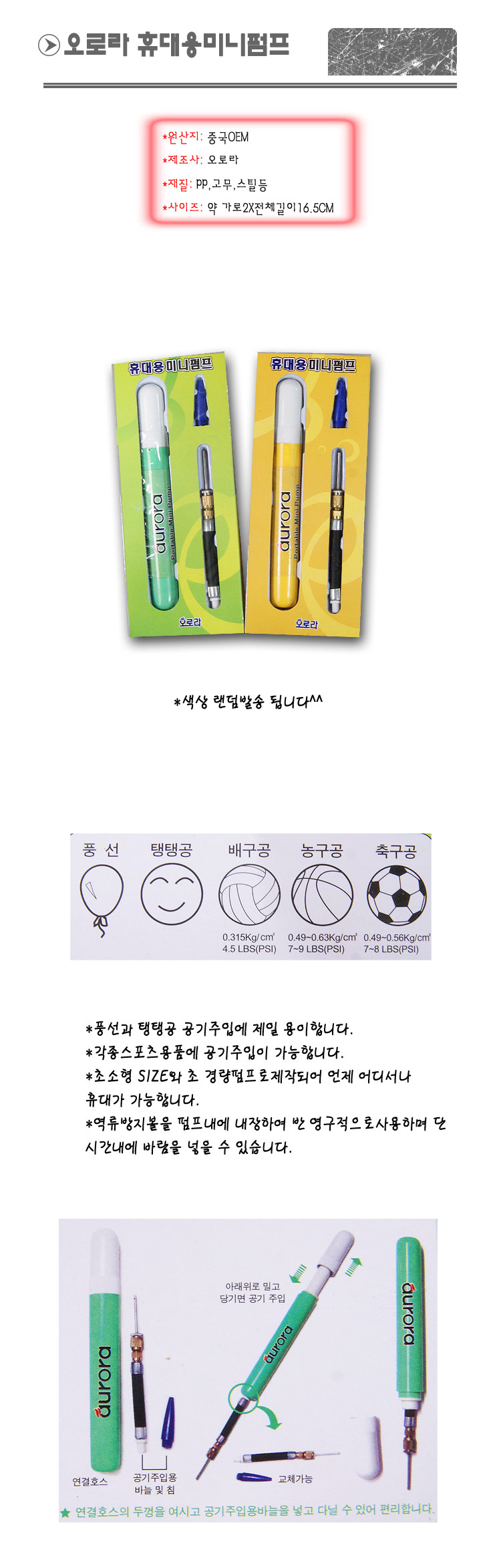 오로라 휴대가 간편한 휴대용미니펌프 1개구성 제품