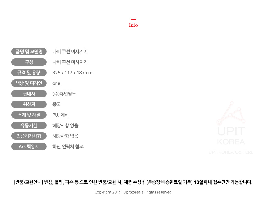 • 초기제품 이상의 경우 동일한 제품으로 1:1 교환원칙, 사용후 제품이상은 A/S를 원칙으로 합니다.