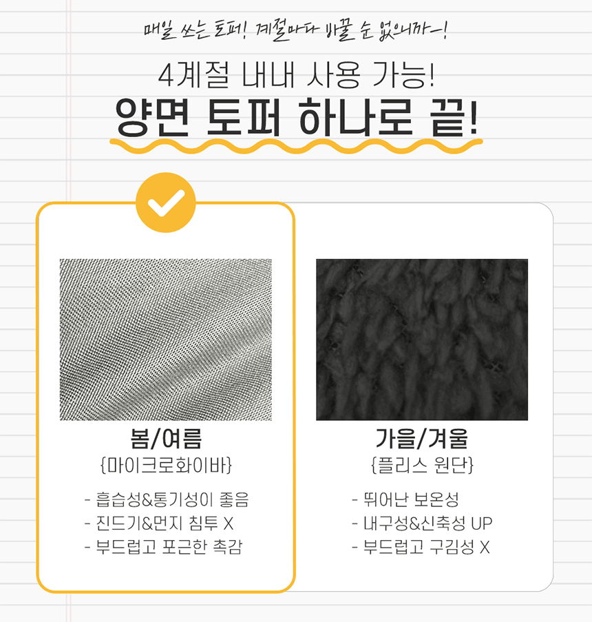 두껍고 푹신한 사계절 양면 토퍼 (4 SIZE) 양면 면