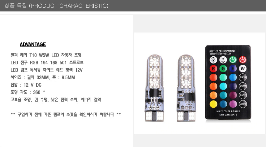 차량 LED 전구 RGB 조명 램프 독서등 스트로브 12V