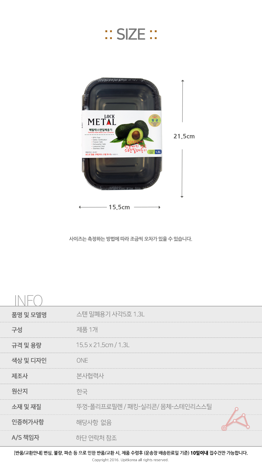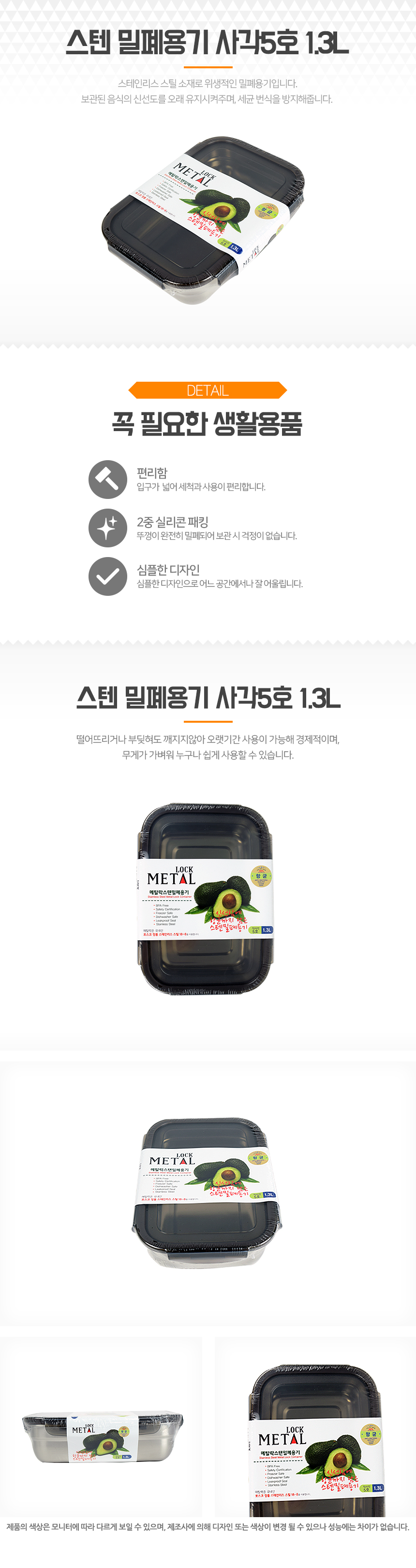 스텐 밀폐용기 사각5호 1.3L 이미지/