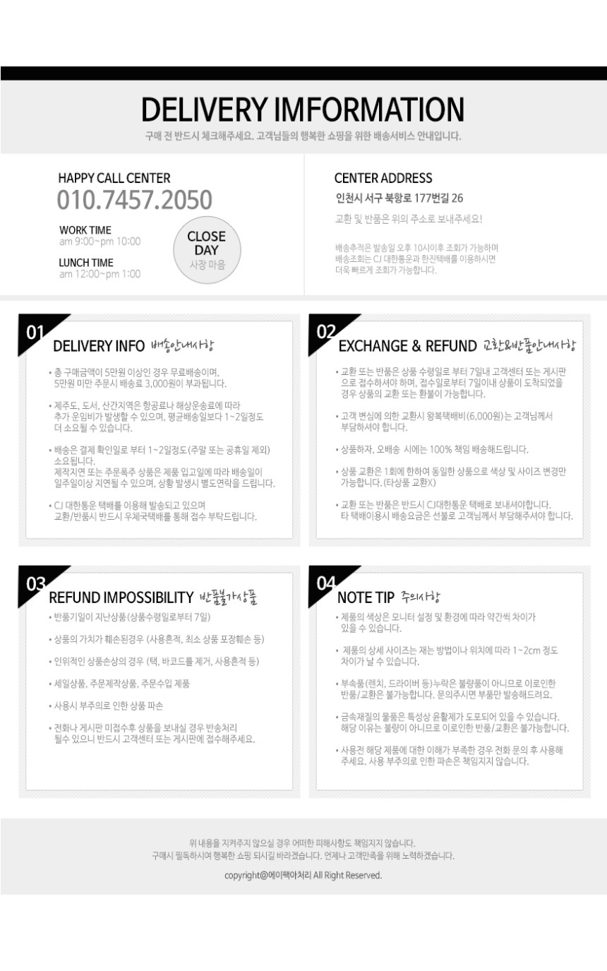 • 반품/환불조건: 도착후 1주일 이내 사용하지 않은 상태에서 가능합니다,초기제품 이상의 경우 동일한 제품으로 1:1 교환원칙, 사용후 제품이상은 A/S를 원칙으로 합니다,